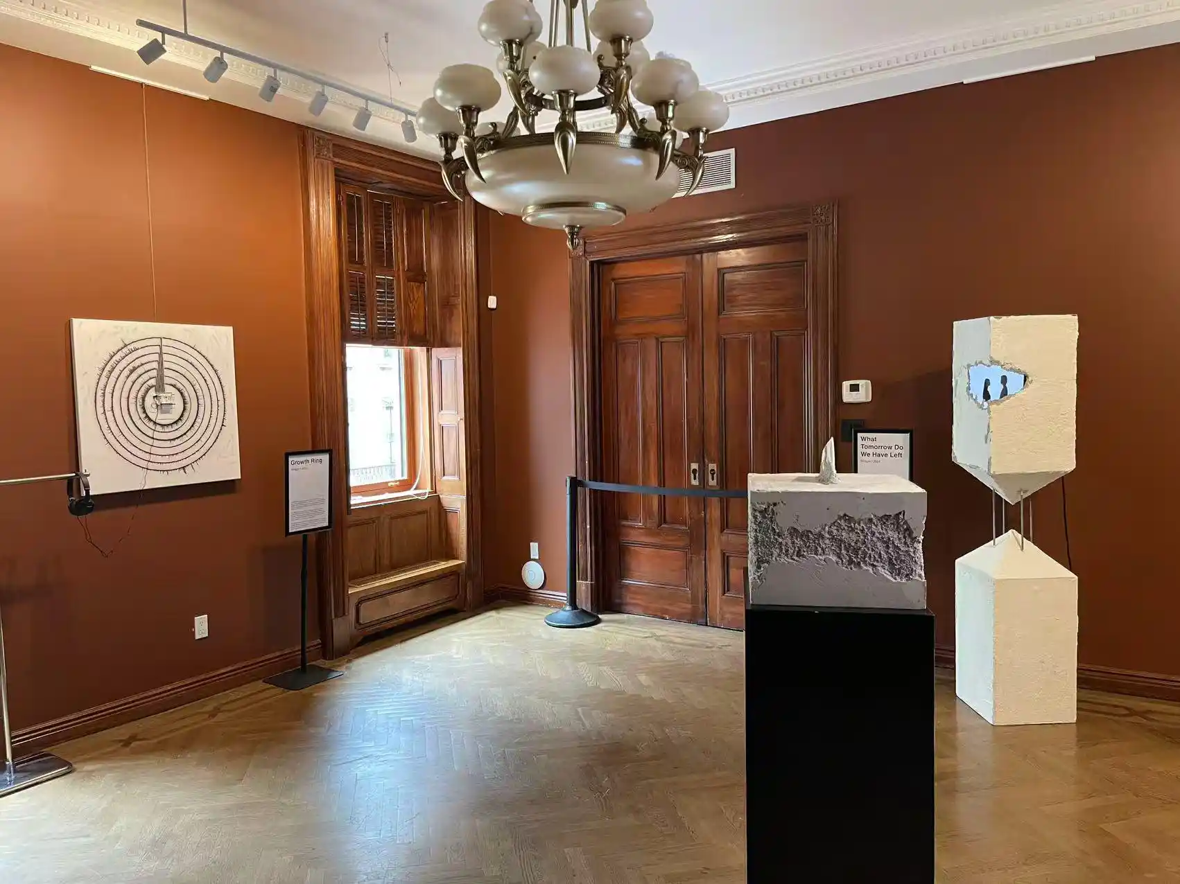 One of the most engaging works, “Growth Ring”, makes this idea physical. The installation takes inspiration from tree rings, natural records of time that expand outward, layer by layer, shaped by environment rather than intention. Gao translates this into an interactive sound piece using conductive paint and embedded circuitry on canvas. Visitors wear headphones and activate different sounds by touching curved sections of a visualized sound wave. There are seven sound environments in total, each loosely corresponding to a life stage. Some are intimate, like muffled heartbeats. Others feel ordinary: footsteps, the sound of unwrapping cheap fruit candy, subway noise. None of them comes with instructions on how they should feel. That’s intentional. The piece doesn’t tell a story so much as it creates space for one. People tend to linger here, touching and re-touching sections, listening again. It feels less like moving forward and more like circling back.